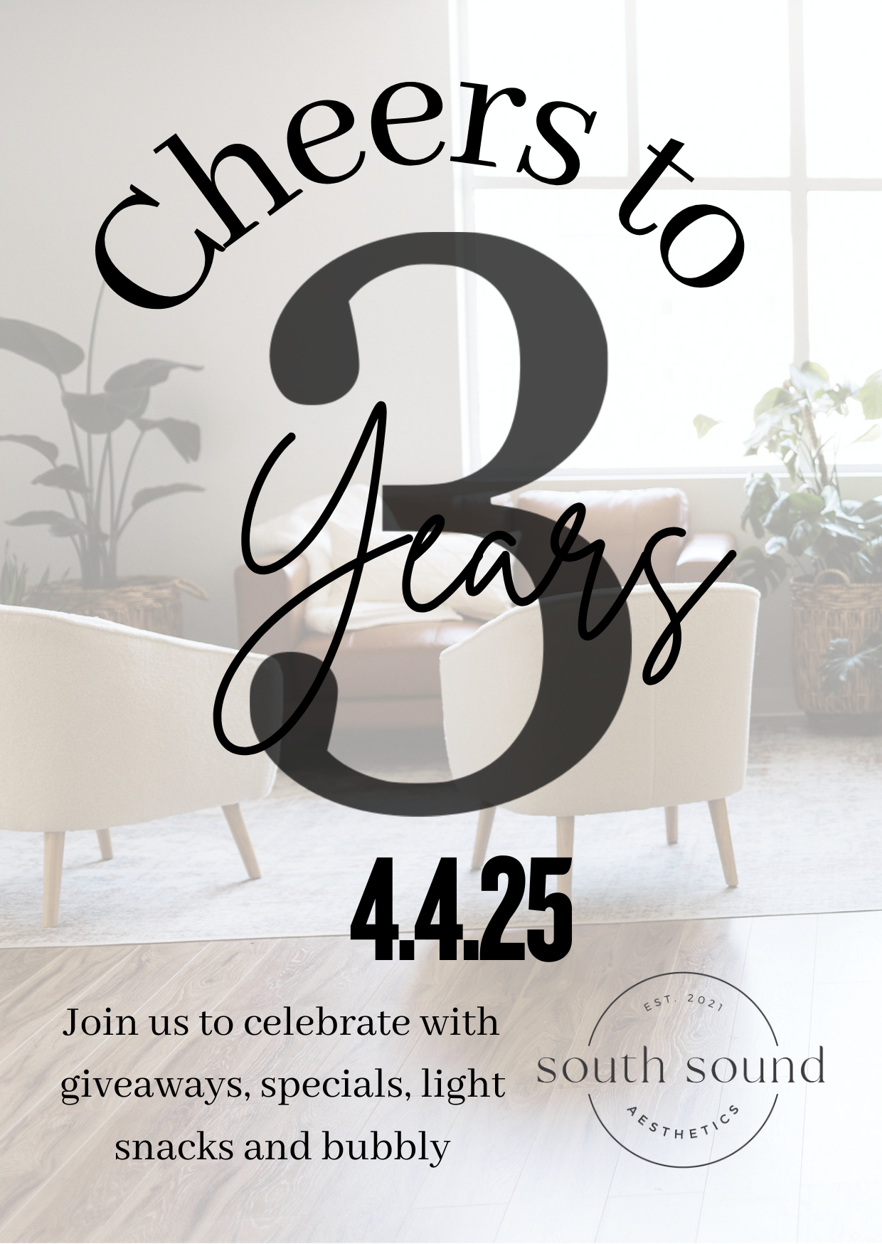 Back to All Events South Sound Aesthetics Anniversary Party Friday, April 4, 2025 4:00 PM 7:00 PM South Sound Aesthetics 1570 Wilmington Drive Suite 240 DuPont (map) Google Calendar ICS South Sound Aesthetics is celebrating three years in business and YOU are invited to our anniversary party 😘 join us from 4-7 p.m. on April 4th for giveaways, specials, snacks, and bubbles 🍾 we so look forward to seeing you 🩷 let’s party 🎉